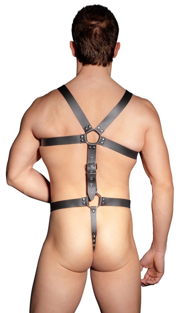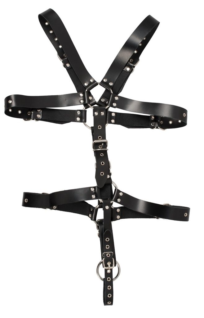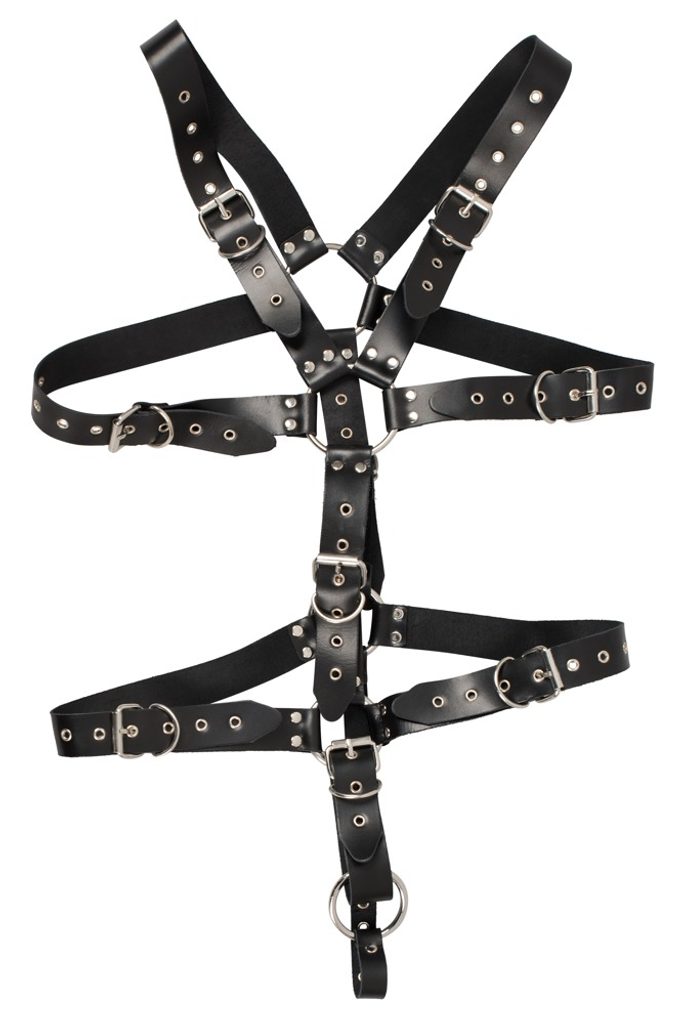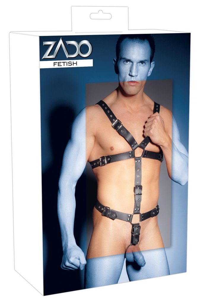 Postroj iz črnih usnjenih trakov z zakovicami in jeklenih povezovalnih obročkov znamke Zado. Nastavljiv je z zapenjanjem na zaponke. Cockring za penis s premerom Ø 5 cm.