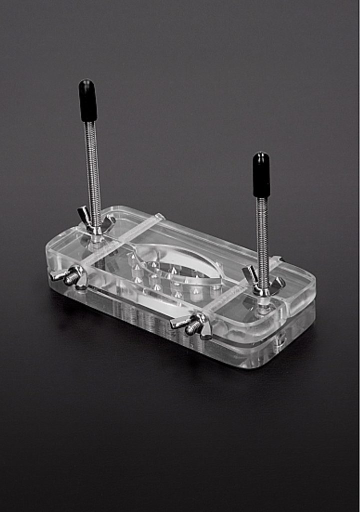 Stisnite mu jajca med akrilne ploščice in opazujte nemoč v njegovih prestrašenih očeh. Z vsakim naslednjim zategom bo le še prosil in rotil za milost. Prosojne ploščice omogočajo pogled na njegova stisnjena moda.