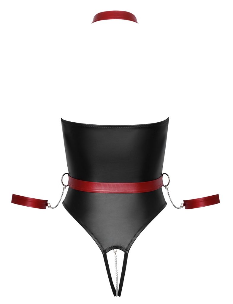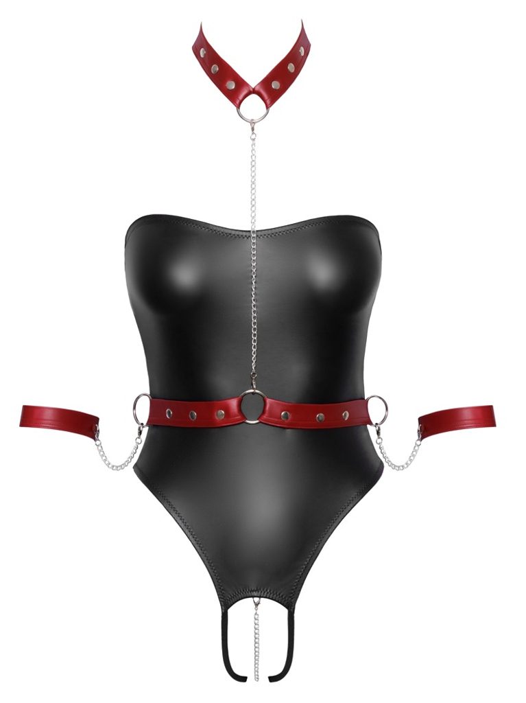 Razkrijte svojo čutnost in uživajte v vznemirljivih trenutkih v tem drznem bodyju brez naramnic in z odprtim mednožjem, ki popolno poudari vaše obline. Eleganten mat videz v črni in rdeči perilu doda prefinjenost, medtem ko nastavljiv postroj z lisicami in ovratnico prinese pridih strastne pustolovščine.