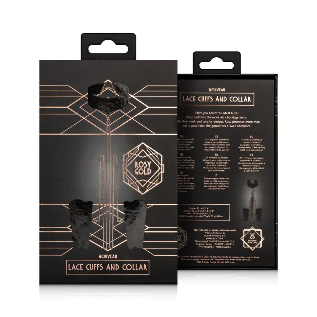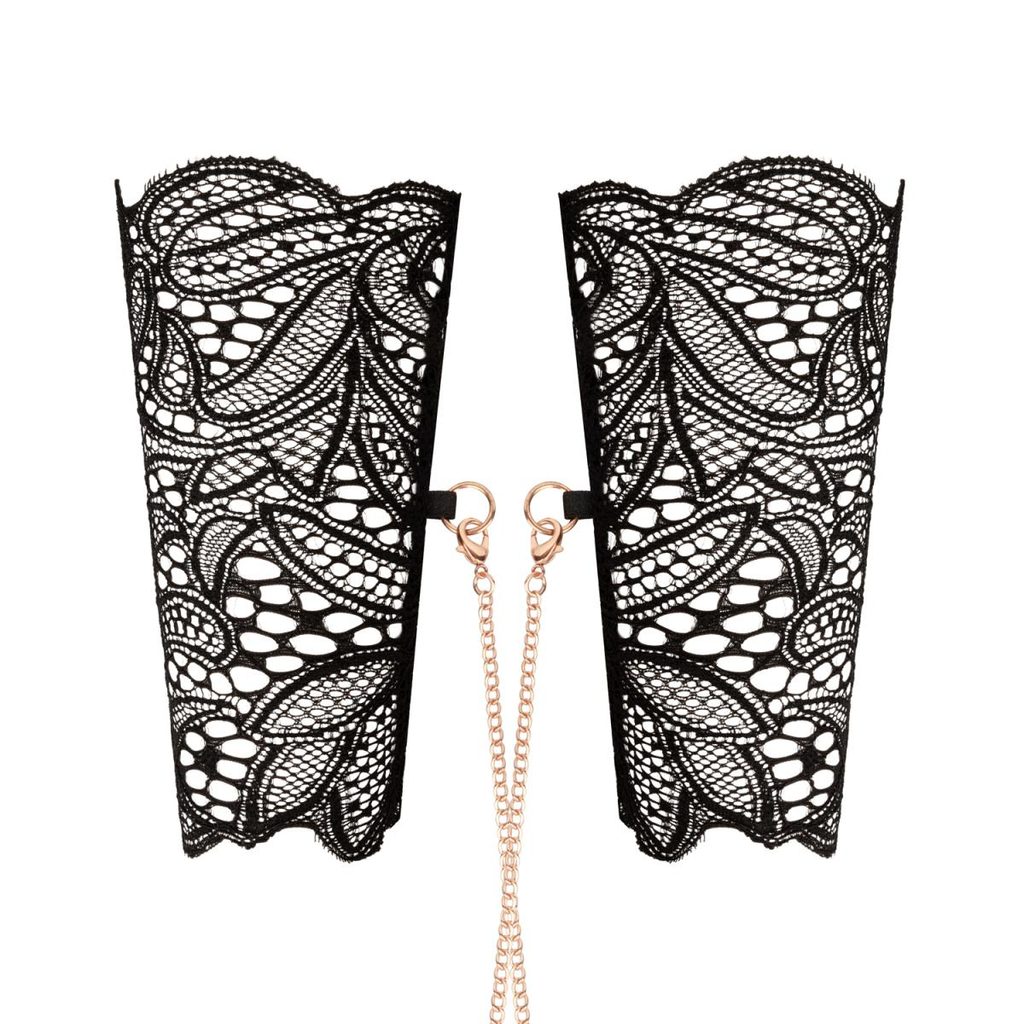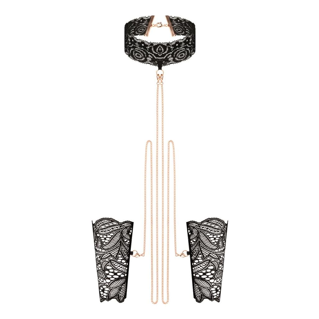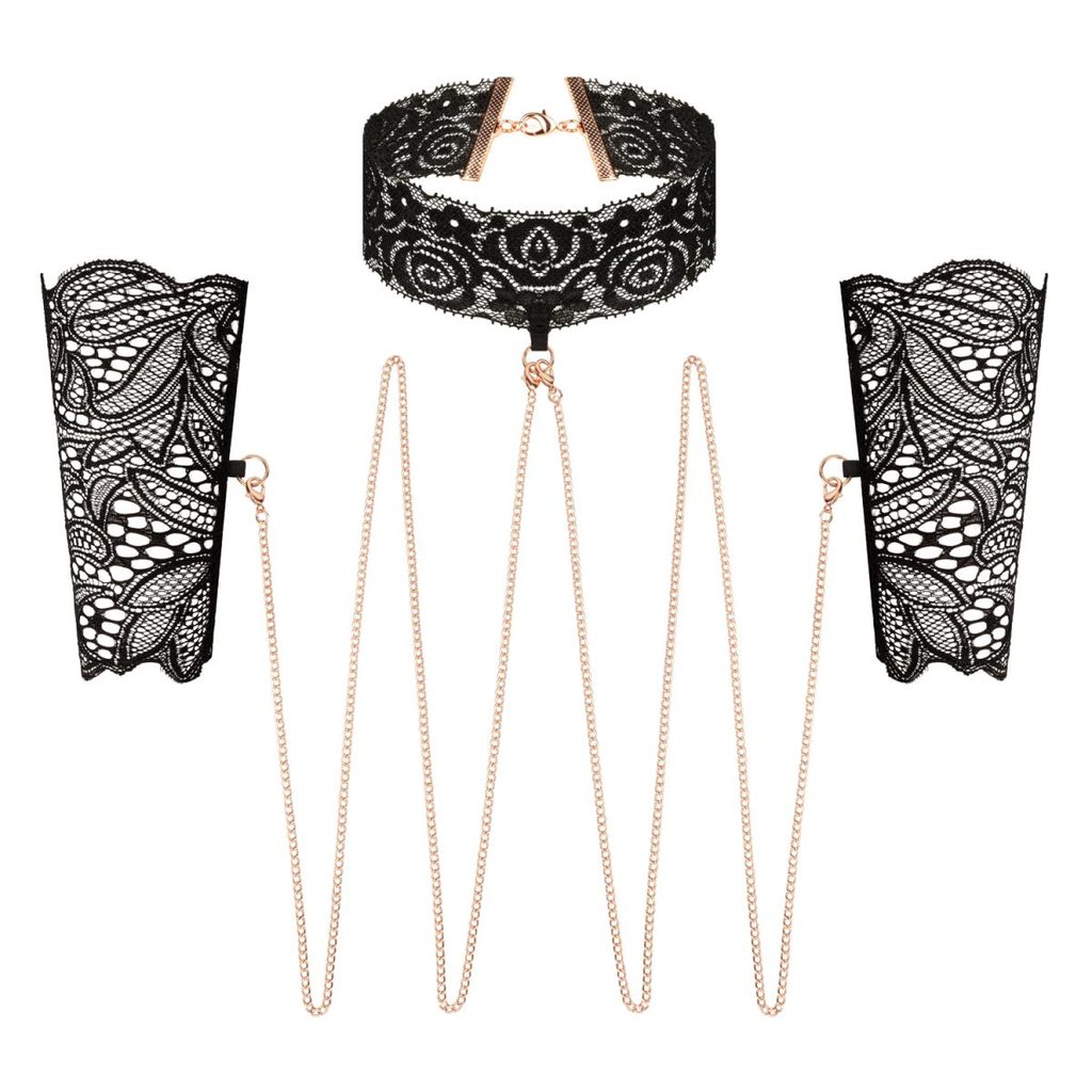 Ogrnite se v čar nežne čipke in bleščečega zlata. Ta luksuzni komplet vključuje nežna čipkasta okova za roke in ujemajoč se ovratnik, povezana s čudovitimi zlatimi verižicami, ki celotni kombinaciji dodajo pridih sofisticirane čutnosti.