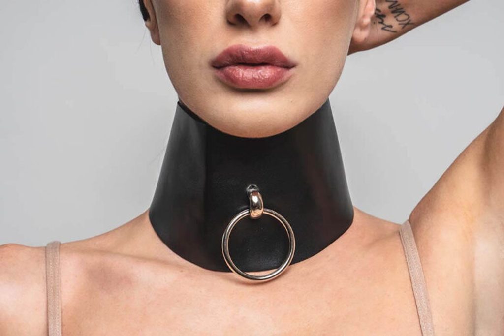 Bondage ovratnica je črne barve, dopolnjena s kovinskim obročkom in zaponkami iz nerjavečega jekla.