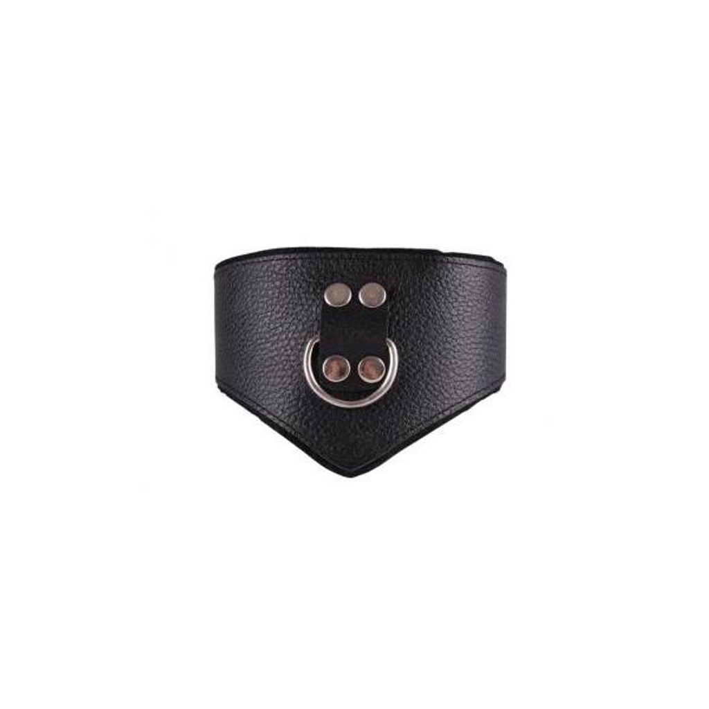 Čudovit usnjen ovratnik z obročkom za povodec, podložen s črnim filcem.