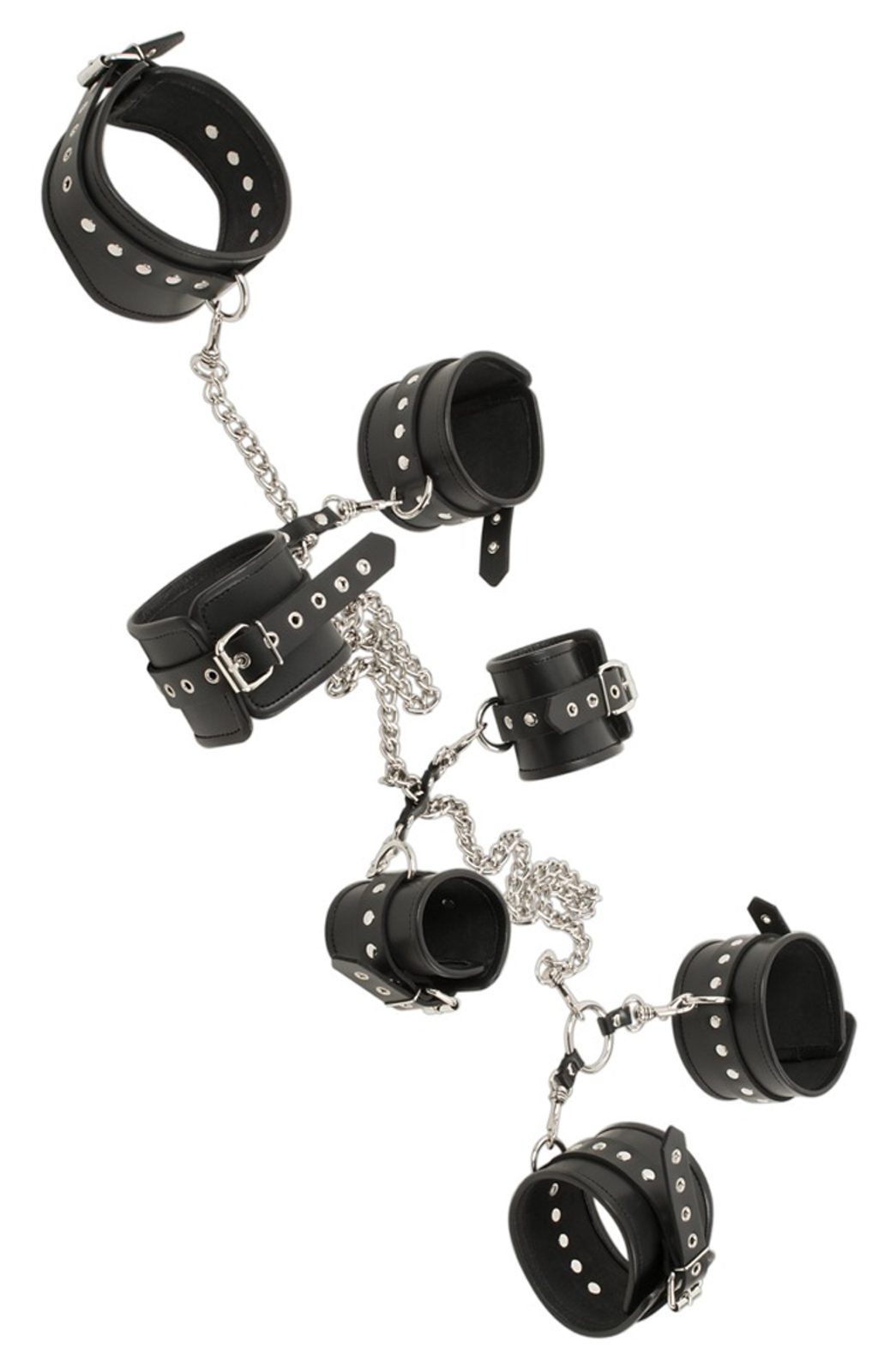 Priloženi so ovratnica, manšete in veriga z vponkami (karabini), ki poskrbijo, da vse ostane na svojem mestu. Trden in kakovosten komplet iz pravega usnja in vzdržljive kovine.