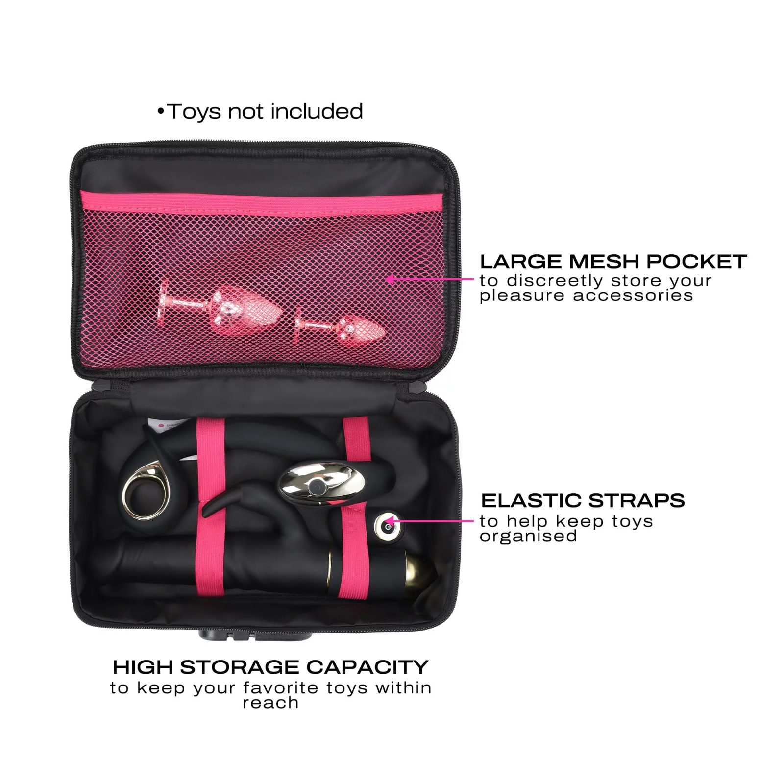 Diskretna škatla znamke Dorcel je varno zatočišče za vaše seksualne igrače in dodatke. Vaše igrače ščiti z močnim sistemom zaklepanja in osebnim geslom. Kapaciteta škatle je 4-5 srednje velikih igrač, njen diskreten dizajn pa je idealen za varno potovanje in shranjevanje. Notranji mrežasti žep in elastični trakovi poskrbijo, da dodatki in čistilna sredstva ostanejo na svojem mestu. Škatla ima 3-mestno kombinacijsko ključavnico, zato ni nevarnosti izgube ključa.