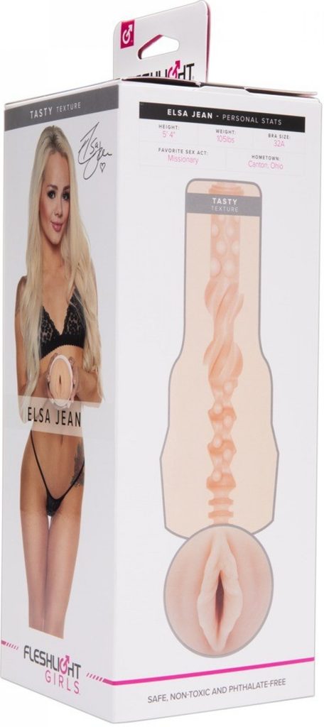 Moški masturbator z odtisom vagine porno igralke Els Jean Tasty iz realističnega materiala z notranjo stimulativno teksturo znamke FLESHLIGHT.