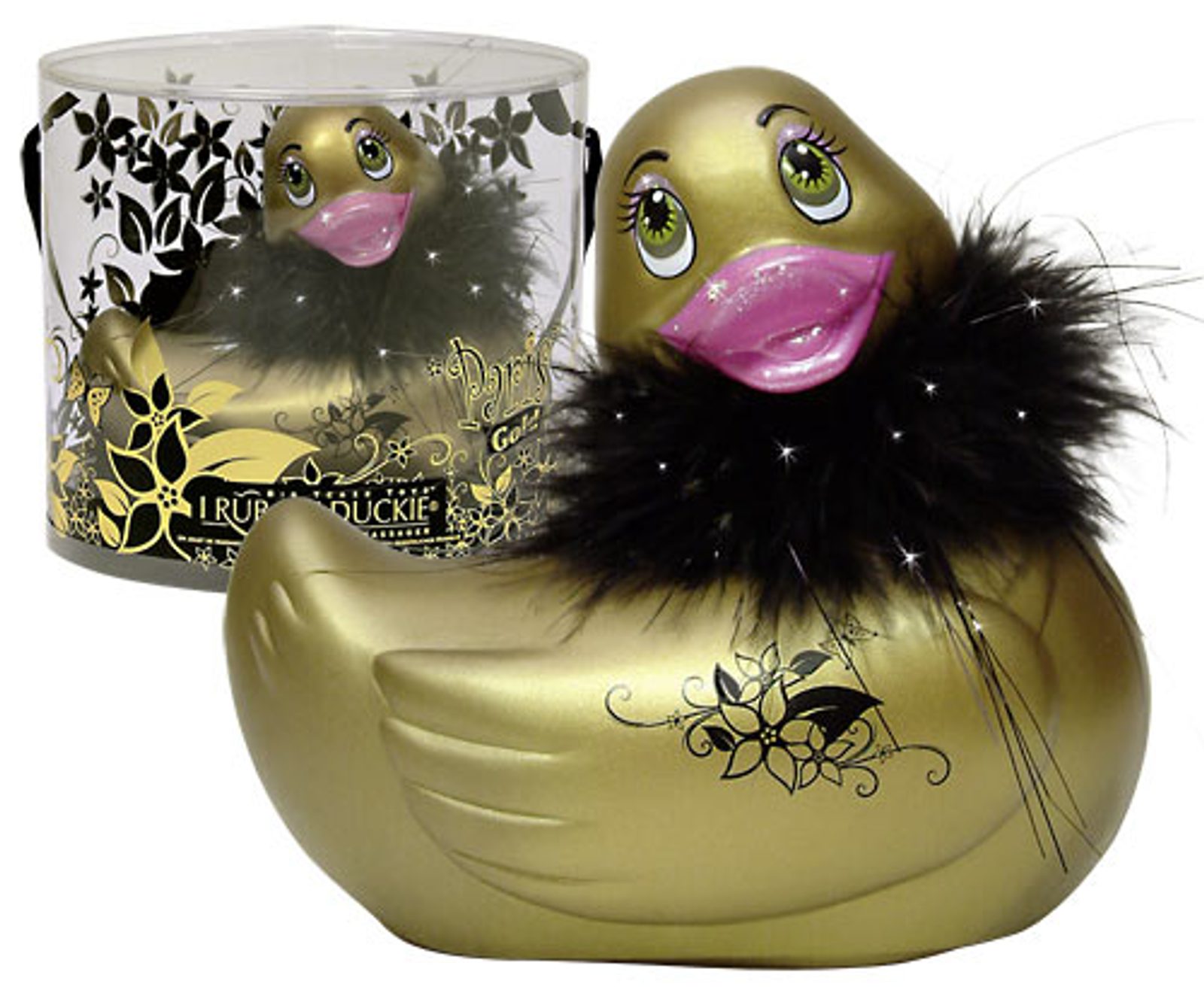 Zlata vibracijska račka je masažna in stimulativna erotična igračka za uporabo v kadi. Čudovita račka ima okoli vratu perjasto boa ogrlico, ki jo je mogoče odstraniti. Kljun je okrašen s svetlečim piercingom, na boku pa ima tetovažo cvetlice. Vibracije se sprožijo s pritiskom na račko. Baterije so vključene v pakiranje. Velikost 12 cm.