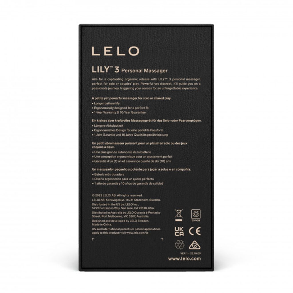 Odkrijte LILY™ 3 znamke Lelo, legendarni mali vibrator, posebej razvit ob 20. obletnici LELO. Idealen za uporabo samostojno ali s partnerjem. Igračka ima 8 zmogljivih nastavitev užitka, ki zagotavljajo nepozabno, a diskretno orgazmično izkušnjo. Naprava je izdelana iz vrhunskega silikona, varnega za telo, ki je topel na dotik. Je popolnoma vodotesna in omogoča neomejeno spolno raziskovanje.