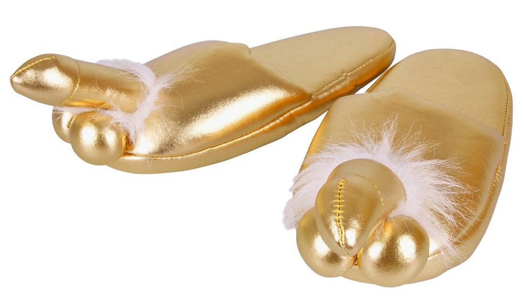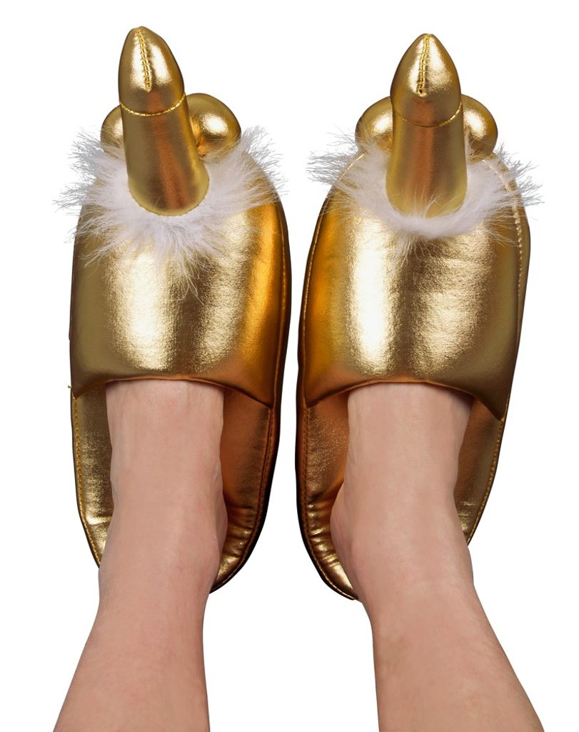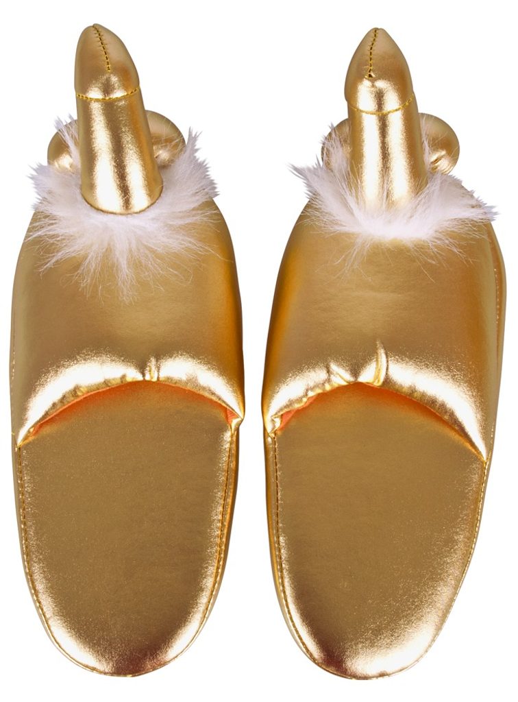 Zlati copati iz mehkega materiala s penisom in modom na sprednjem delu vsakega copata. Standardna velikost: cca 37 do 43. Material: zgornji del 100 % poliester, podloga 100 % polipropilen.