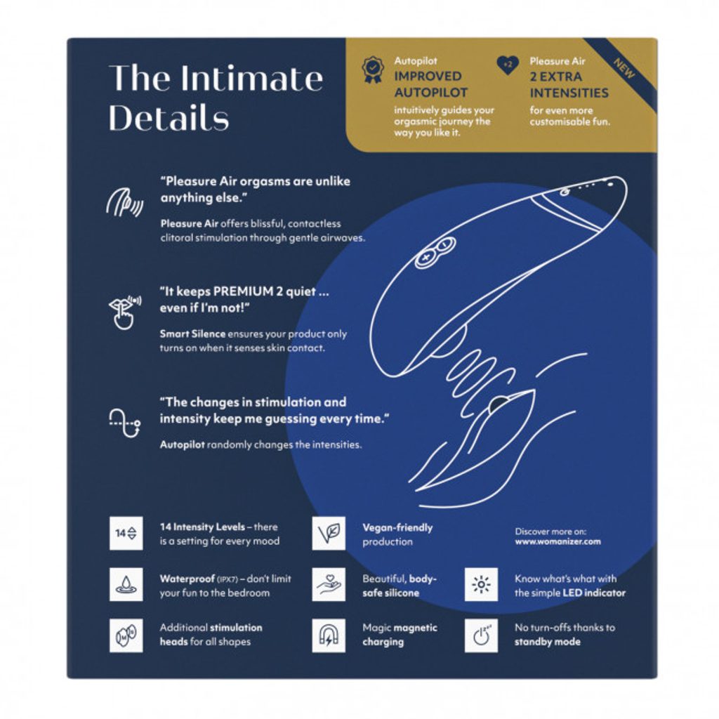 Womanizer Premium 2 je zmogljiv, a tih stimulator zračnih valov, ki ponuja 14 različnih intenzivnosti. Intenzivnost je mogoče enostavno prilagoditi s tipkama (+/-). Patentirana tehnologija Pleasure Air zagotavlja natančno stimulacijo klitorisa brez neposrednega stika. Lahko ga uporabljate tudi v kadi ali pod prho, saj je vodoodporen. Nova in izboljšana funkcija samodejnega pilota samodejno spreminja intenzivnost, kar naredi užitek še bolj presenetljiv. Womanizer Premium 2 se aktivira samo ob stiku s kožo zaradi funkcije Smart Silence. Do takrat je Premium 2 v skoraj tihem stanju pripravljenosti. Womanizer Premium 2 se samodejno izklopi, če se ne uporablja 10 minut.