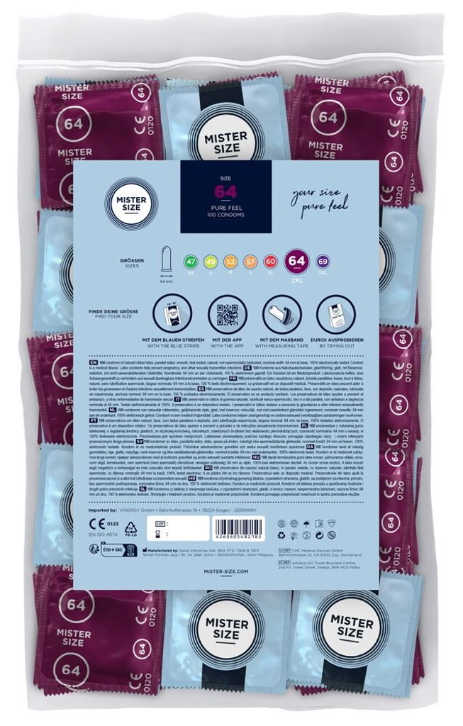 Z MISTER SIZE 64 ste končno našli kondom, ki vam zagotavlja vsestransko dober občutek. Ščipanje, zvijanje in nenehen občutek napetosti so preteklost – zdaj se začne čisti užitek. Ko kondom sproščeno odvijete pred ljubljenjem, se vaše močno, atletsko telo in kondom združita v popolno celoto, ki ustvari čudovite trenutke čutnega užitka. Privoščite si veselje!