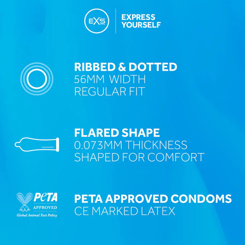 Rebrasti kondomi znamke EXS za varen seks. Rebra in pikice poskrbijo za močnejši užitek.