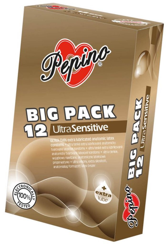 PEPINO BIG PACK 12 kosov v škatlici. Kondom PEPINO ultra tanek za maksimalno občutljivost, dodatno lubrikiran s silikonskim oljem. Anatomsko oblikovan, iz naravnega lateksa, z rezervoarjem, naravne barve, gladka površina, nominalna širina 52 mm. Z nežno vaniljevo dišavo. 100 % elektronsko testirano. Pravilna uporaba kondomov lahko pomaga zmanjšati tveganje nosečnosti, prenosa HIV/AIDS ali drugih spolno prenosljivih okužb. Kondomi Pepino so medicinski pripomočki. Pred uporabo pozorno preberite navodila za uporabo v notranjosti embalaže.