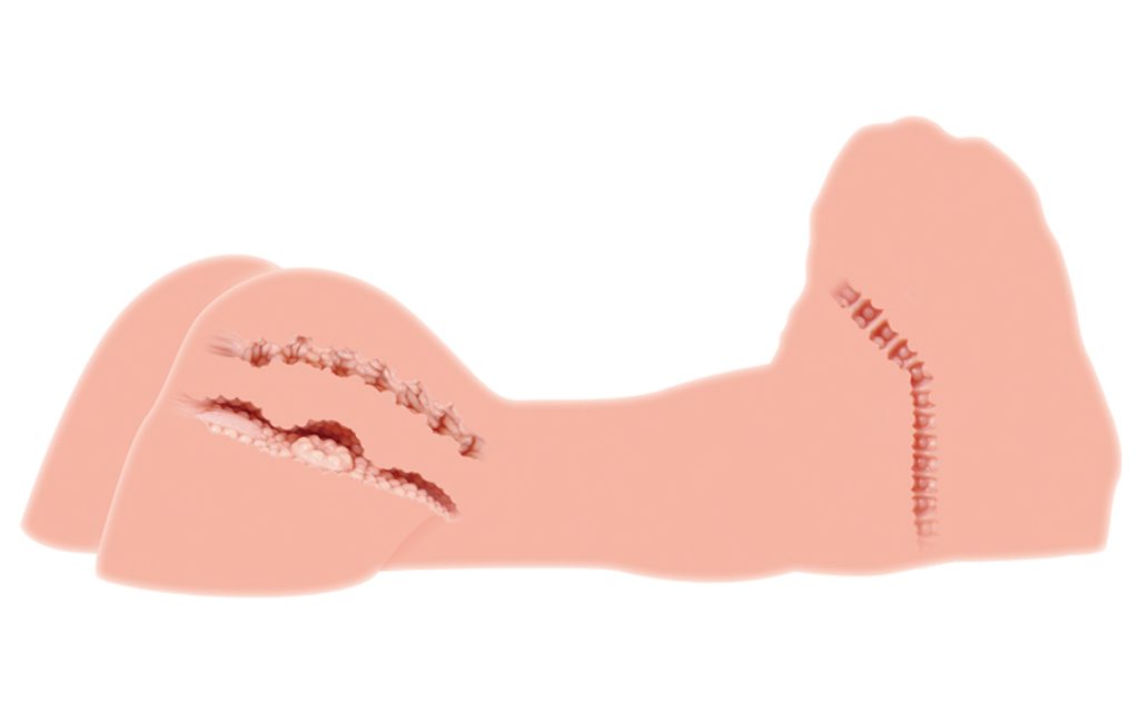 Realističen vhod v analno odprtino. Oblikovane izbokline, žlebičenje in celotna reliefna struktura danke so zasnovani tako, da se ob vsakem vašem potisku celotna odprtina stisne.