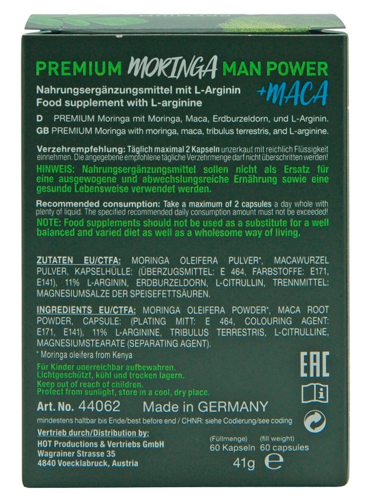 Prehransko dopolnilo Pure Moringa + Maca Man Power znamke HOT je posebej za moške in vsebuje L-arginin, moringo, maco in Tribulus terrestris.