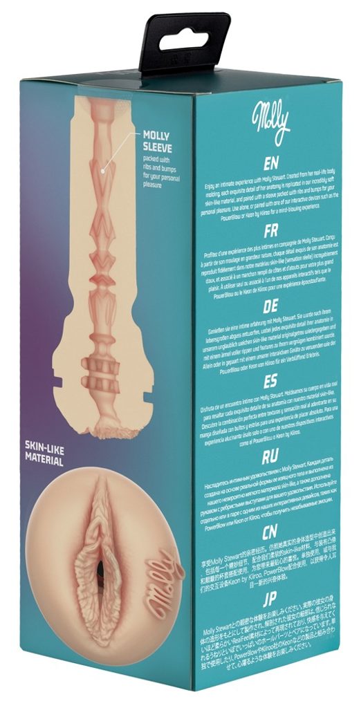 Avtentičen dizajn in podpis Molly Stewart – natančno oblikovana replika, dopolnjena z originalnim podpisom ob vulvi. Ultra mehak material – mehak, prožen in na otip spominja na človeško kožo. Diskretno ohišje s pokrovčkom – idealno za udoben oprijem in enostavno čiščenje. Možnost interaktivne izkušnje – združljiv z napravami Kiiroo PowerBlow in Kiiroo Keon (nista vključena). Enostavno vzdrževanje – notranji rokav lahko preprosto odstraniš in opereš.