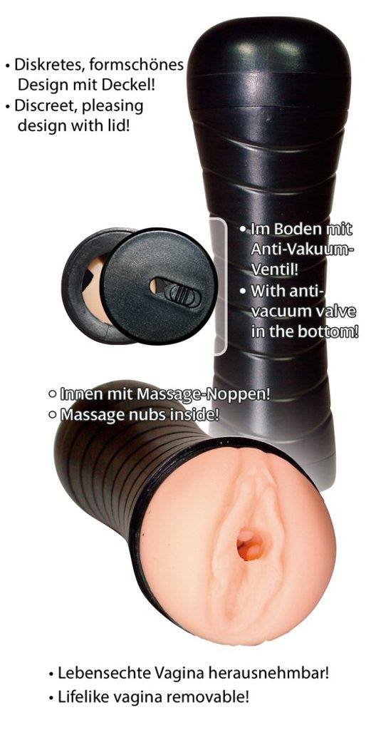 ... za hitro solo zabavo doma ali na poti! V elegantni črni škatli se pod robustnim pokrovom skriva mehka, realistična vaginica z debelimi masažnimi grebeni. Škatla je dolga 27 cm, Ø 6,5 cm do 8 cm, s protivakuumskim ventilom na dnu za gladko in ponavljajoče se drsenje. Notranjost je tesno prilegajoča (raztegljiva). Izdelek je odstranljiv iz škatle (za čiščenje). Material: TPR, ABS.