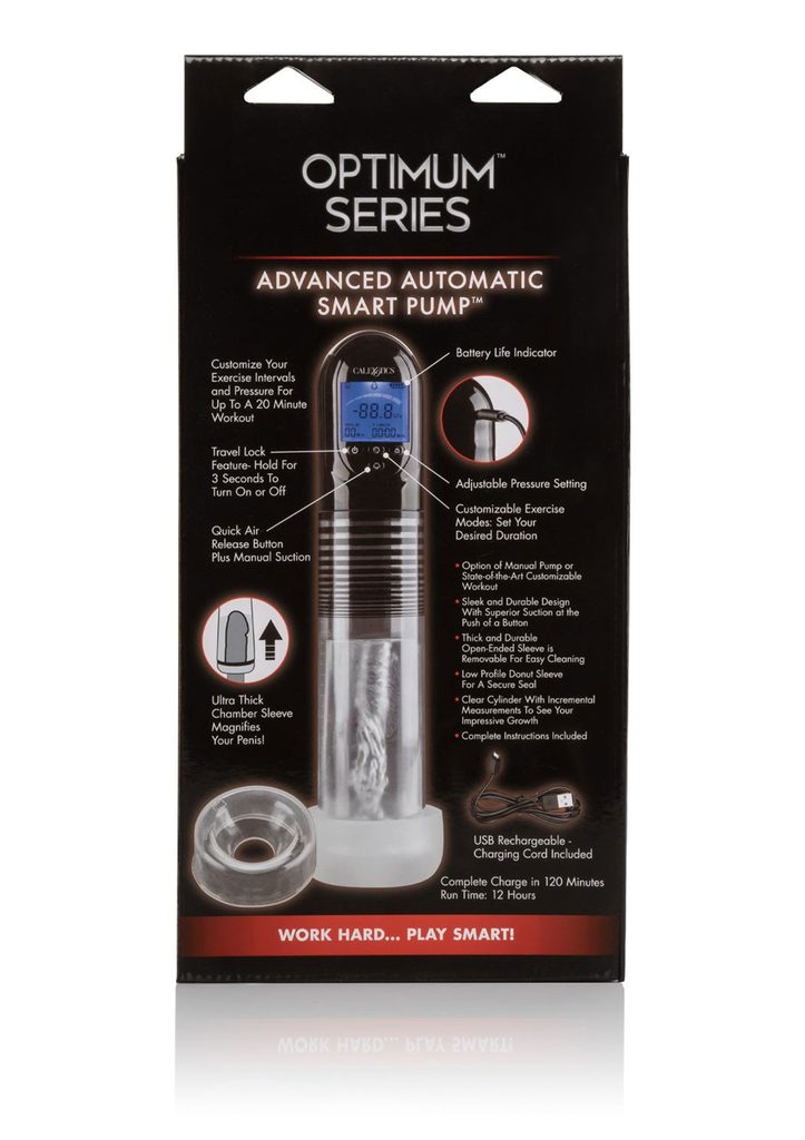 Maksimizirajte svoje orodje za užitek z napredno avtomatsko pametno črpalko Optimum Series znamke CalExotics. Elegantna in vzdržljiva penis črpalka, izdelana za odlično sesanje in izboljšanje zmogljivosti. Povečajte vzdržljivost, izboljšajte zdržljivost in okrepite svoj penis s to serijo prilagodljivih vadbenih načinov.