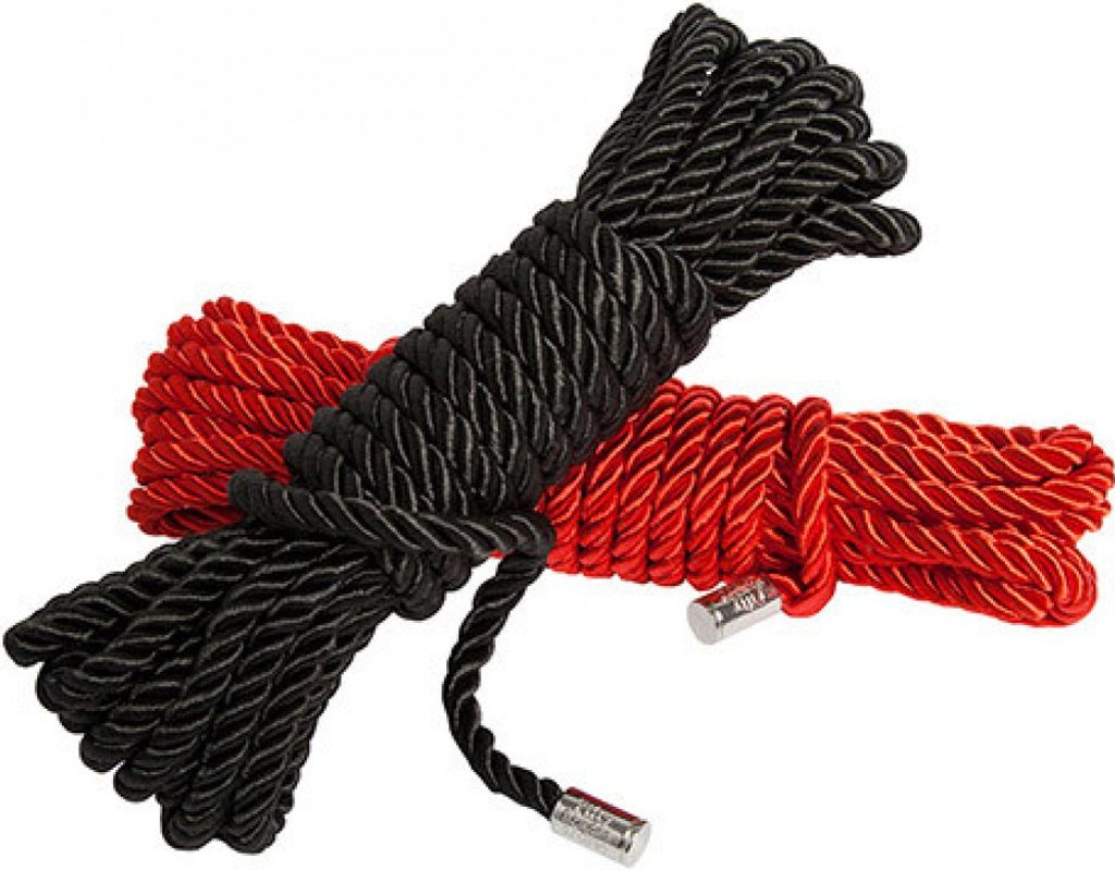 Rdeče-črni svilnati vrvi iz kolekcije Fifty Shades of Grey s kovinskimi konci. Dolžina vsake je 5 m.