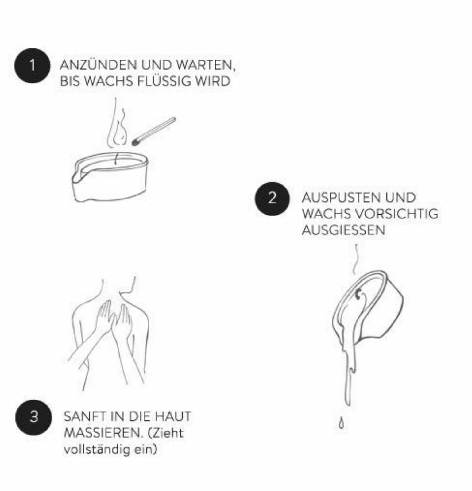 Prižgite svečo in jo pustite goreti 15–20 minut. Svečo ugasnite in previdno nalijte na roke majhno količino toplega olja. Olje uporabite za čutno masažo (ni primerno za intimne predele, popek ali obraz).