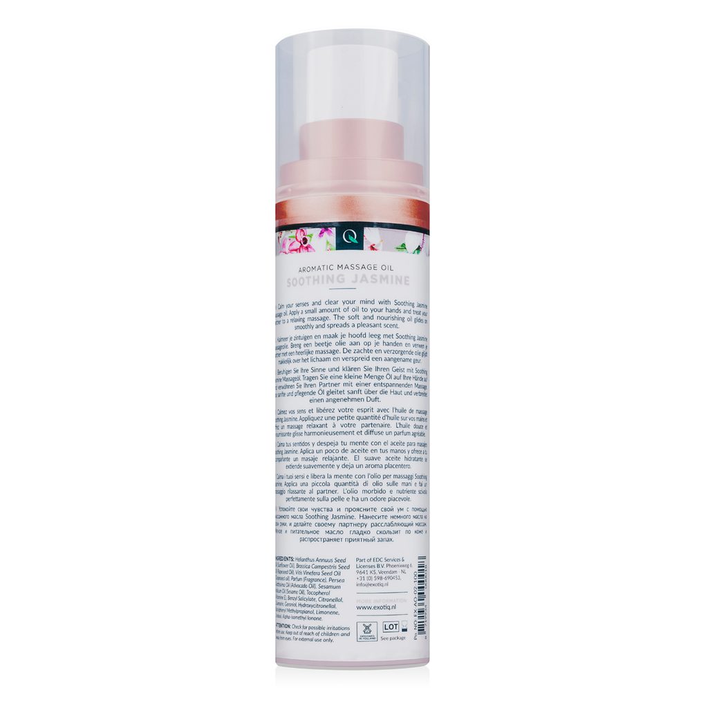 Uživajte v sproščujočem učinku masažnega olja Exotiq. To masažno olje ima čudovit vonj jasmina. S pomočjo pumpice nanesite na roke majhno količino olja, podrgnite roke, da se olje segreje, in pripravljeni ste na sproščujočo masažo. Masažno olje je svilnato nežno in ima negovalni učinek.
