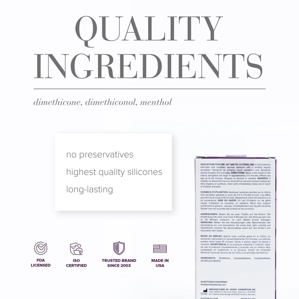 JO Arctic klitoralni stimulans, z najintenzivnejšo hladilno formulo, postopoma ustvari leden občutek, ki spodbudi in okrepi vsak dotik in gibanje. Njegova premium silikonska sestava ostane točno tam, kjer jo nanesete, in je vodoodporna, kar omogoča dolgotrajno zabavo pod prho, v kadi ali masažni kadi. Idealen je za solo in partnersko raziskovanje, še posebej se poda k vibracijskim igračkam in oralnemu užitku.