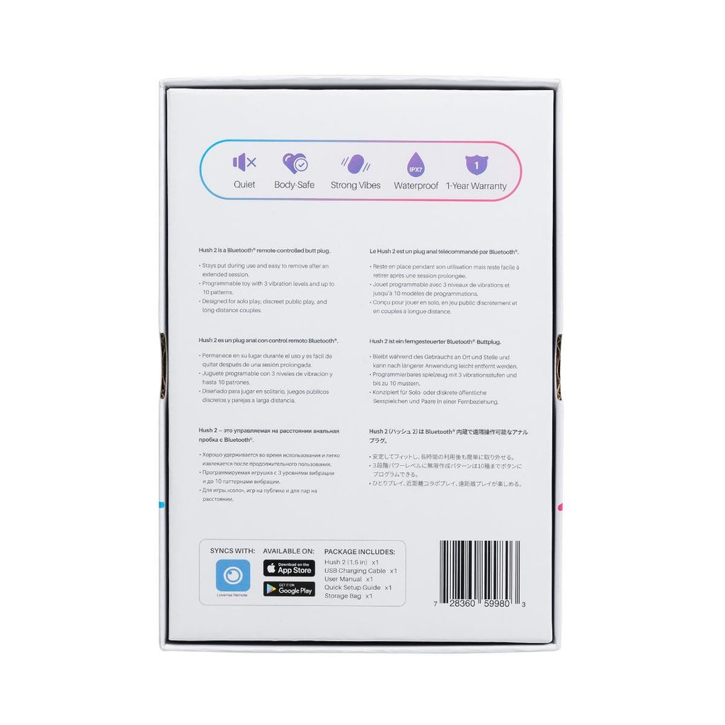 Hush 2 je druga generacija zmogljivega analnega čepa znamke Lovense. Upravlja se prek bluetooth. Zaradi novega elegantnega in gladkega dizajna je udobnejši za kratkotrajno ali dolgotrajno nošenje, kjerkoli ste.
