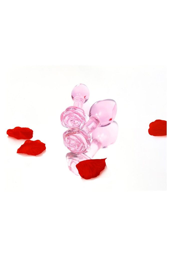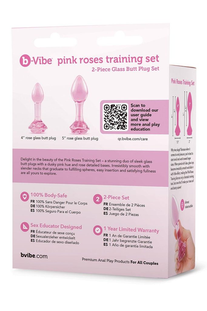 Privoščite si romantiko za svojo zadnjico z novim kompletom b-Vibe Pink Roses Glass Butt Plug Training Set – dinamičnim duetom elegantnih steklenih analnih igrač v nežno rožnatem odtenku z detajli vrtnic na podstavkih. Natančno izdelani čepki z ozkimi vratovi, ki prehajajo v čutno zaobljene krogle, vam omogočajo odkrivati svet skozi »rožnata očala« – tokrat v obliki rožnatih analnih čepkov.