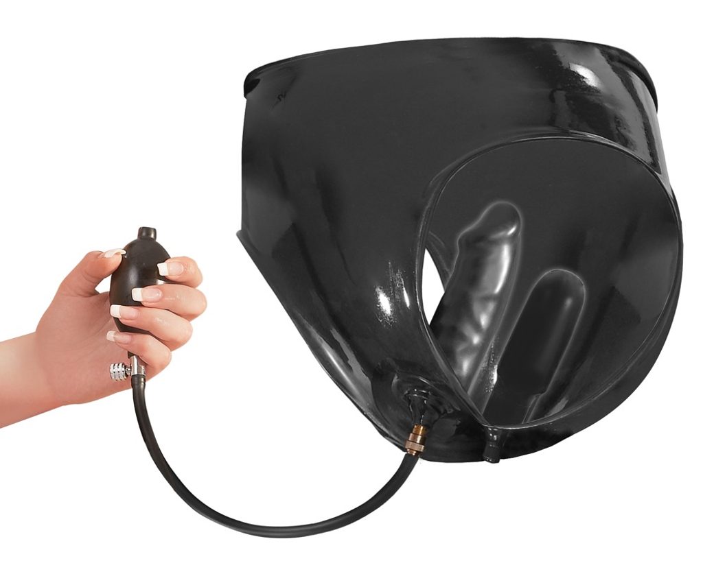 Lateks hlačke z dvema napihljivima dildoma v notranjosti. Vključuje ročno pumpico (balonček).