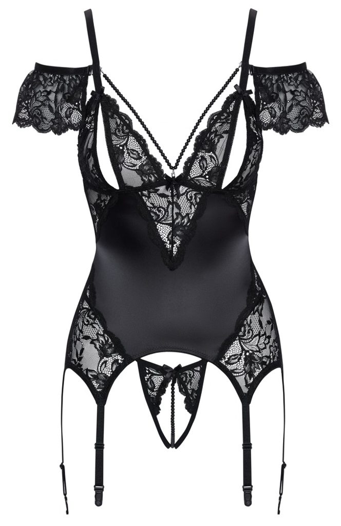 Ta črn dvodelni komplet sestavljata korzet (basque) in string tangice z odprtim mednožjem. Sijoč satenast material dopolnjuje nežna čipka in drobne pentljice, ki modelu dodajo ženstven in sofisticiran značaj. Zaradi mehkega in elastičnega izdelovanja se komplet udobno prilagodi telesu.