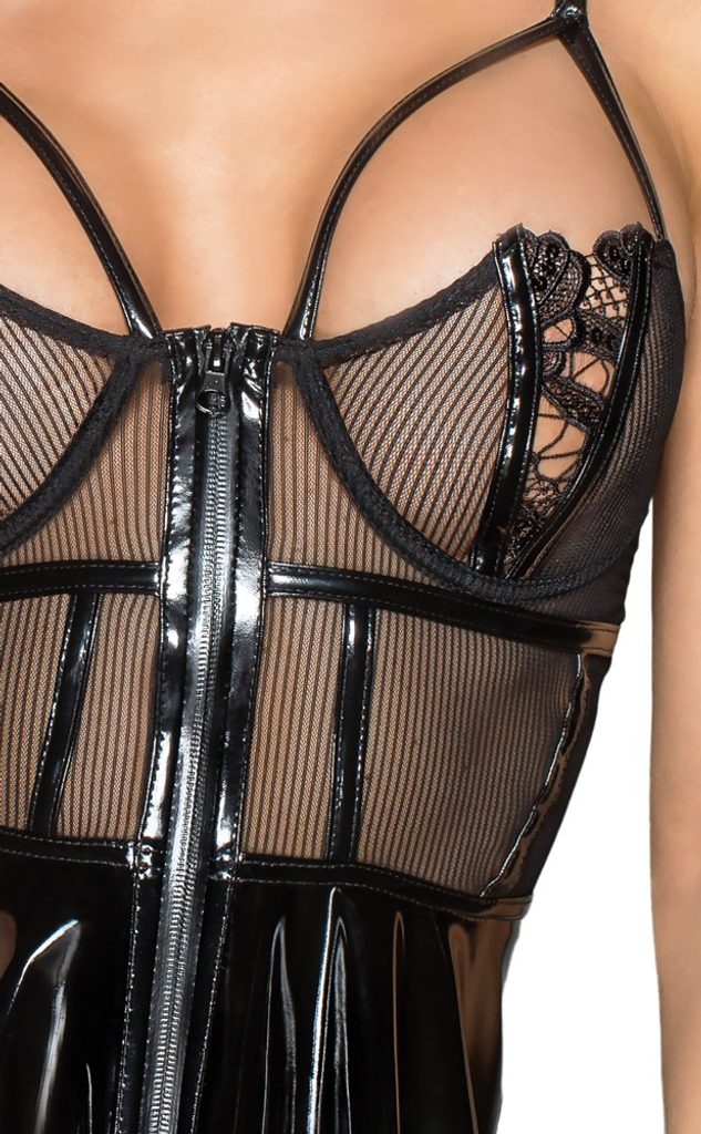 Idealno za divje (party) noči!Polprosojna obleka s črtami in poudarjenim oprsjem, oblikovalnimi kostmi, nastavljivimi vinilnimi naramnicami in okrasnimi naramnicami. S kratkim razširjenim krilom iz sijočega vinila. Čudovite vezenine na košaricah, okrasni vinilni trakovi in zadrga po celotni dolžini spredaj dopolnijo seksi outfit.77 % poliester, 23 % spandeks, polimerni premaz; mrežica 93 % poliamid, 7 % spandeks.POMEMBNO! Za Noir velja ločena tabela velikosti!
