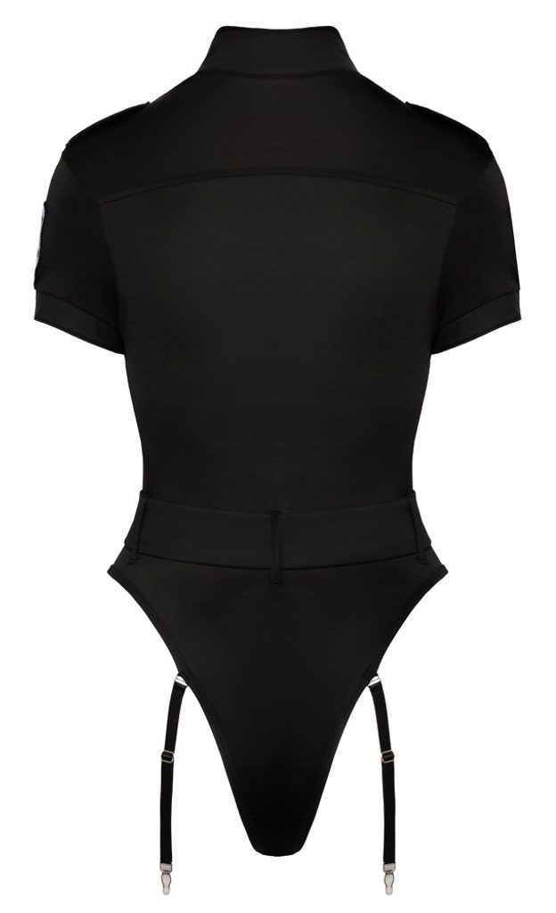 Črno podvazkasto body znamke Cottelli COSTUMES v slogu specialne policije z izrazito našitko na levem ramenu. Izdelano iz mehkega elastičnega materiala, kombiniranega z mat in sijočim wetlook učinkom. Body ima strog videz z visokim stoječim ovratnikom in polrokavi. Ramenske in prsne lopute dodajo tipičen policijski videz. Priložene so zanke za priložen elastičen pas z elegantno srebrno zaponko. Trojno zapenjanje na zadrgo poteka od visokega stoječega ovratnika vse do mednožja. Podvazke so nastavljive in jih je mogoče z bodyja popolnoma odstraniti.