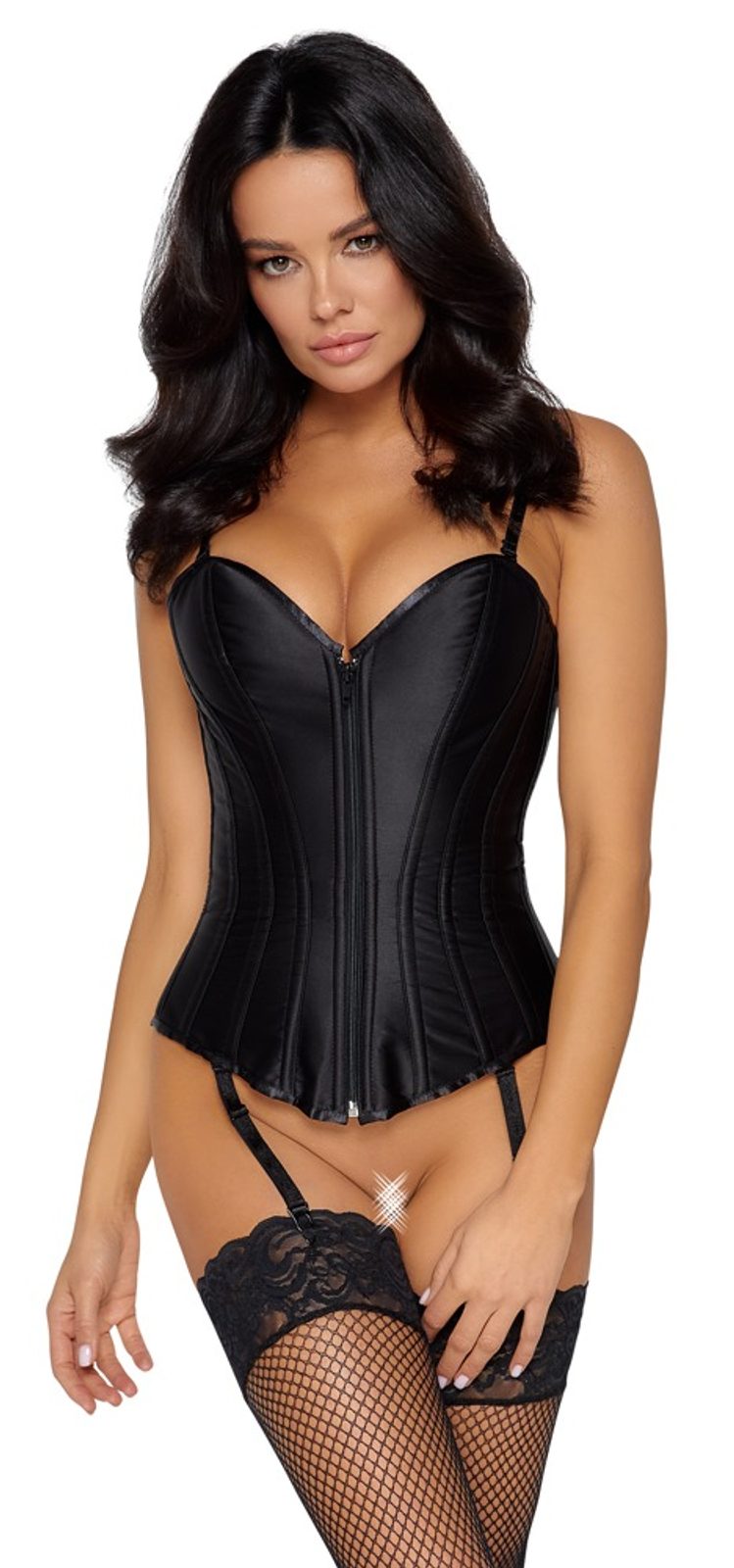 Korzet čez prsi znamke Cottelli PARTY je izdelan iz nežnega mat satena. Všite oblikovalne kostnice (7 na vsaki strani) zagotavljajo popolno udobje in lepo silhueto. Praktična sprednja zadrga omogoča hitro oblačenje in slačenje. Zadaj je zavezovanje ojačano s kovinskimi palicami in podloženo z blagom, zato koža ni razkrita. Nastavljive naramnice in podvezice lahko kadarkoli popolnoma odpnete.