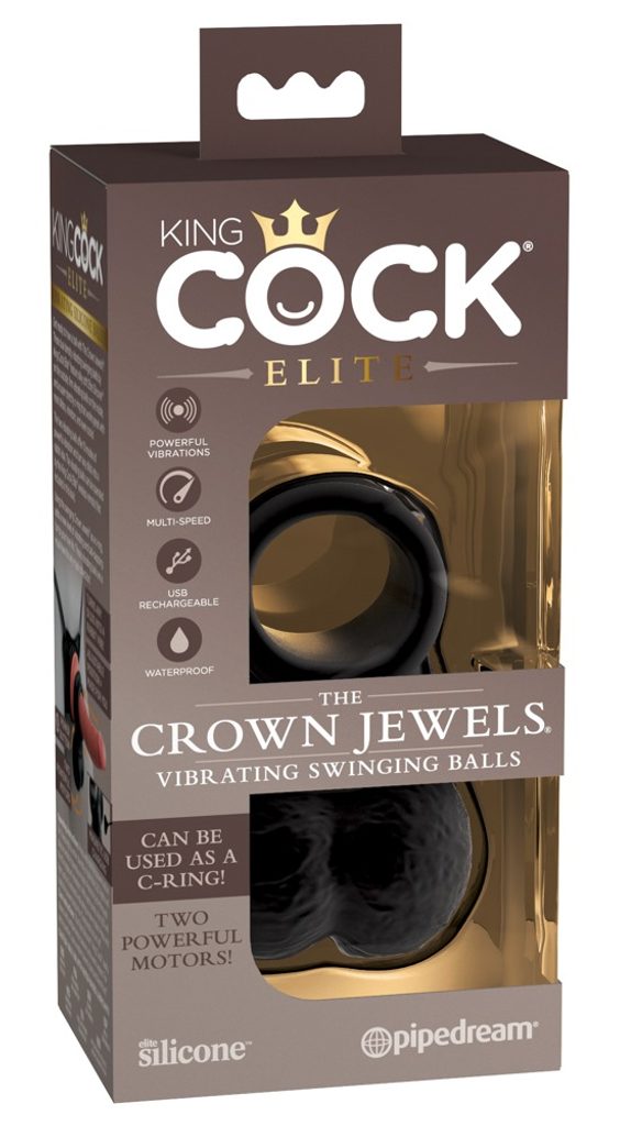 Erekcijski obroč The Crown Jewels – Vibrirajoče nihajoče kroglice King Cock Elite z nihajočimi se težkimi vibrirajočimi modi. Realistično replicirana moda iz silikona z dvojno gostoto imajo mehko, koži podobno površino, v notranjosti pa sta nameščeni 2 težki vibrirajoči kroglici. Z vsakim potiskom vibrirajoča moda realistično vibrirajo in vzburljivo udarjajo ob predel genitalij.