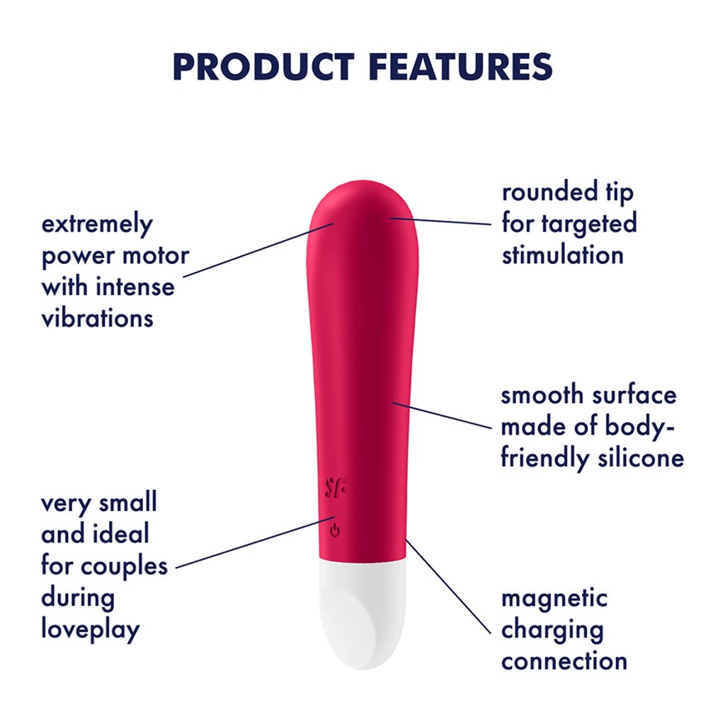 Ultra Power Bullet 1 je Satisfyerjev bullet, ki bo razgrel vaše užitke! Ultra Power Bullet 1 je zelo majhen, a z zmogljivim motorjem in popolno velikostjo za povečanje strasti med dvema ljubimcema. Ta Satisfyerjev bullet je opremljen z močno, zaobljeno konico, ki je odlična za splošno stimulacijo. Njegova osnova iz ABS plastike omogoča dober oprijem in še lažje upravljanje.