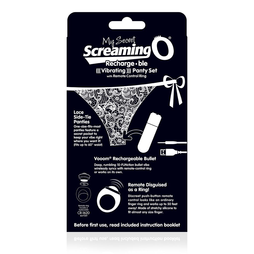 My Secret Screaming O Charged Panty je na daljinsko upravljanje vodena, polnilna vibracijska kroglica z 10 funkcijami, ki diskretno zdrsne v ujemajoč se par čipkastih hlačk, ki se udobno prilegajo do 152 cm obsega pasu.
